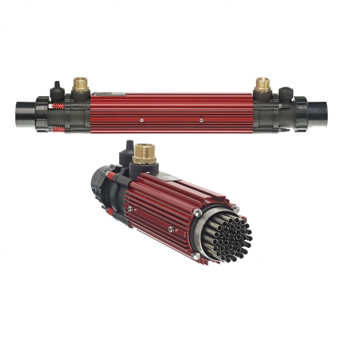 Das kompakte Titan-Multi-Rohrbündel Element befindet sich in einer optimal isolierten Außenkammer. Das geringe Volumen der Kammer in Verbindung mit der hohen Oberfläche der Titanröhren sorgt für einen hervorragenden Wirkungsgrad mit minimalen Energieverlusten.