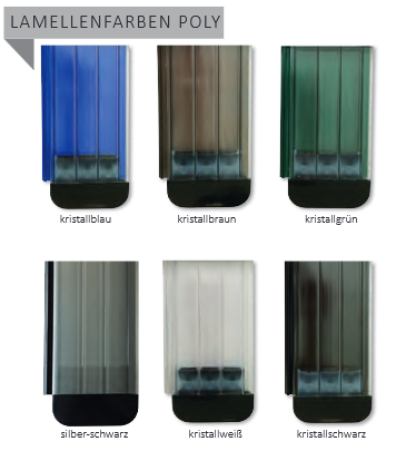 - Polycarbonat: Kristallblau, Kristallbraun, Silber-Schwarz, Kristallschwarz