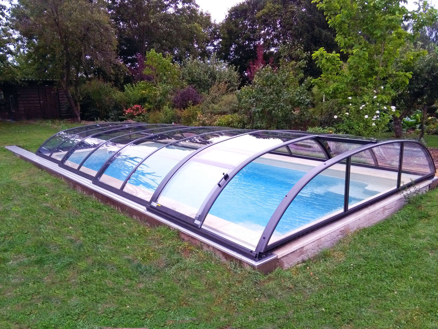 ehrere Radiusbiegungen fliessen hier in Kombination zusammen, so daß das Ergebnis eine ausgewogene, elegante Pool-Überdachung mit niedriger Höhe ist. Jeder wird es schätzen, der möchte, daß die Überdachung sich im Garten stilvoll integrieren läßt.