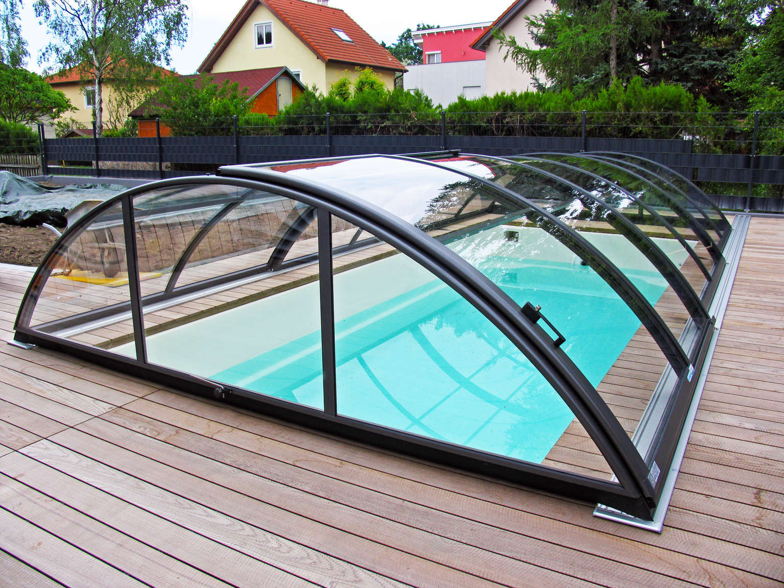 ehrere Radiusbiegungen fliessen hier in Kombination zusammen, so daß das Ergebnis eine ausgewogene, elegante Pool-Überdachung mit niedriger Höhe ist. Jeder wird es schätzen, der möchte, daß die Überdachung sich im Garten stilvoll integrieren läßt.