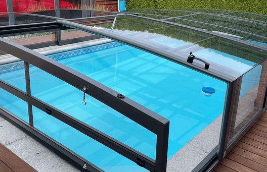Schwimmbad mit transparenter Glasabdeckung im Garten.
