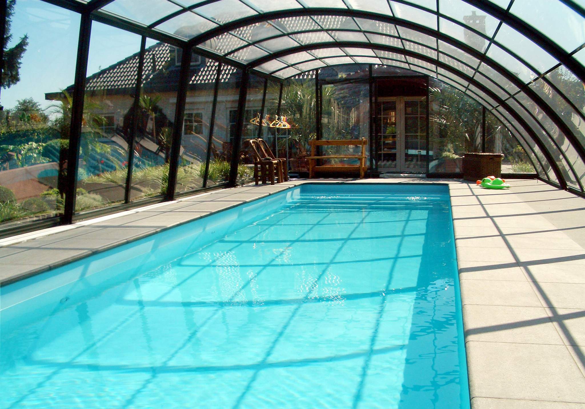 Das Modell RAVENA ist die ideale Balance von Größe und Funktionalität. Als Kombination von vertikalen Wänden (mit einem Winkel von ca. 80° zum Boden) und Bogensegmenten ermöglicht dieses Dach uneingeschränkte Bewegungsfreiheit auf drei Seiten des Pools. In der vertikalen Seitenwand ist eine Schiebetür platziert, in der Vorder- und Rückwand kann optional eine Schiebetür integriert werden. Dieses Modell eignet sich ideal für an Gebäude oder Mauern angrenzende Schwimmbäder.